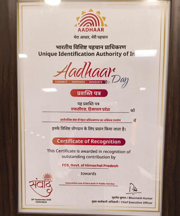 हिमाचल प्रदेश को आधार आधारित फेस ऑथेंटिकेशन के अभिनव उपयोग के लिए राष्ट्रीय स्तर पर सम्मानित किया गया है। यह पुरस्कार भारतीय विशिष्ट पहचान प्राधिकरण (UIDAI) द्वारा हैदराबाद में आयोजित आधार दिवस समारोह के दौरान प्रदान किया गया।