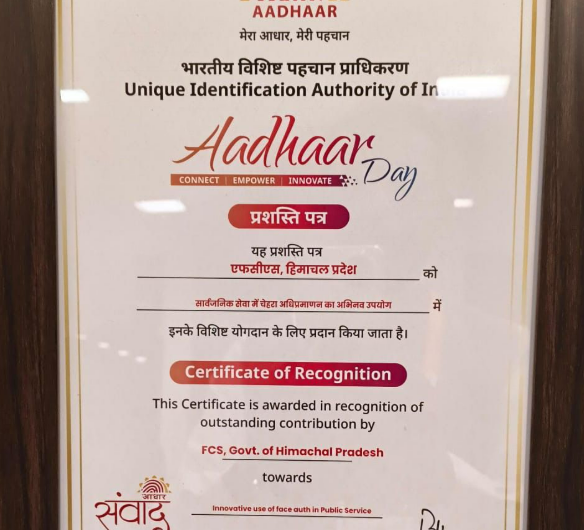 हिमाचल प्रदेश को आधार आधारित फेस ऑथेंटिकेशन के अभिनव उपयोग के लिए राष्ट्रीय स्तर पर सम्मानित किया...